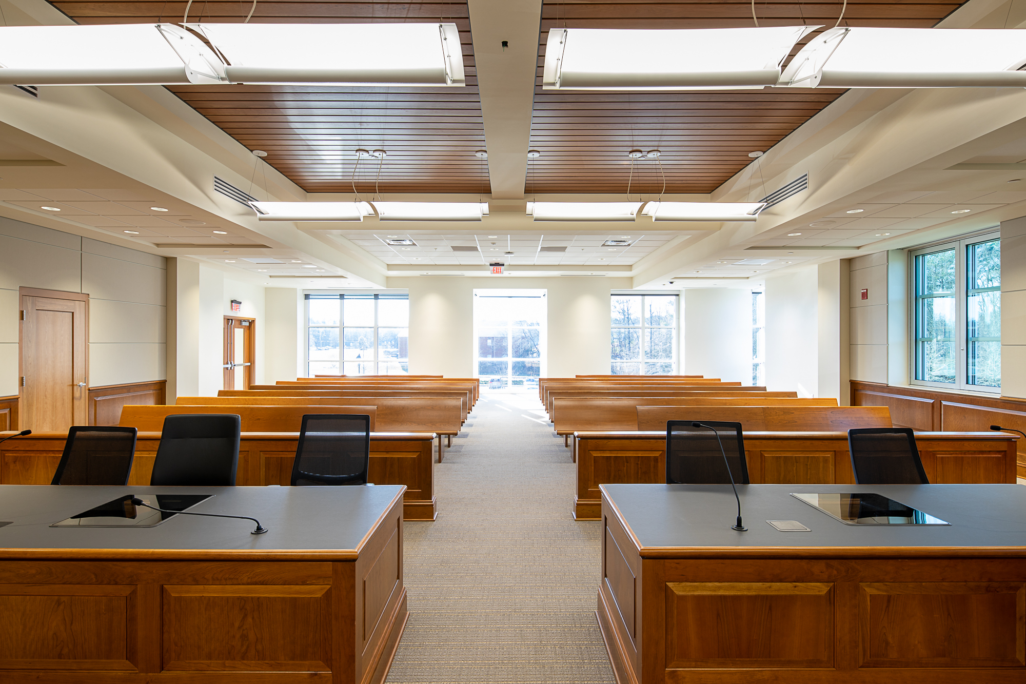 The building incorporates specialized courtroom and security systems, including acoustical and security ceiling assemblies, courtroom casework, detention equipment, security glazing and hardware, jury seating, and courtroom bench seating. Site improvements included earthwork, asphalt paving, and concrete installation.