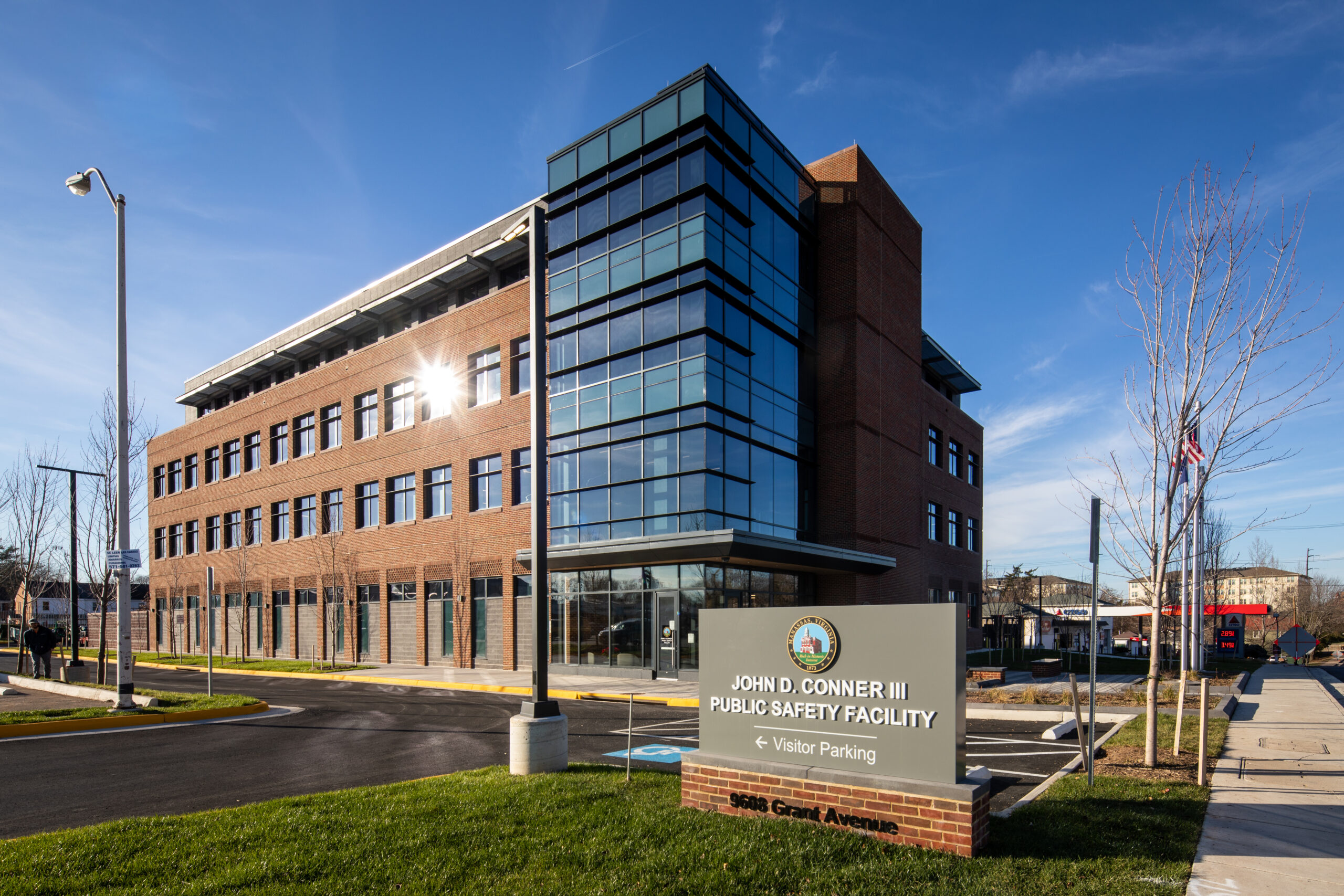 Kenbridge Construction partnered with HOK Group, Inc. to deliver the Manassas Public Safety Facility, a new municipal building at 9608 Grant Avenue in Manassas, VA. Construction began in September 2020 and was completed in September 2022. The facility includes 107,000 square feet of building space and 16,000 square feet of structured parking, with one basement level and four floors above grade.
