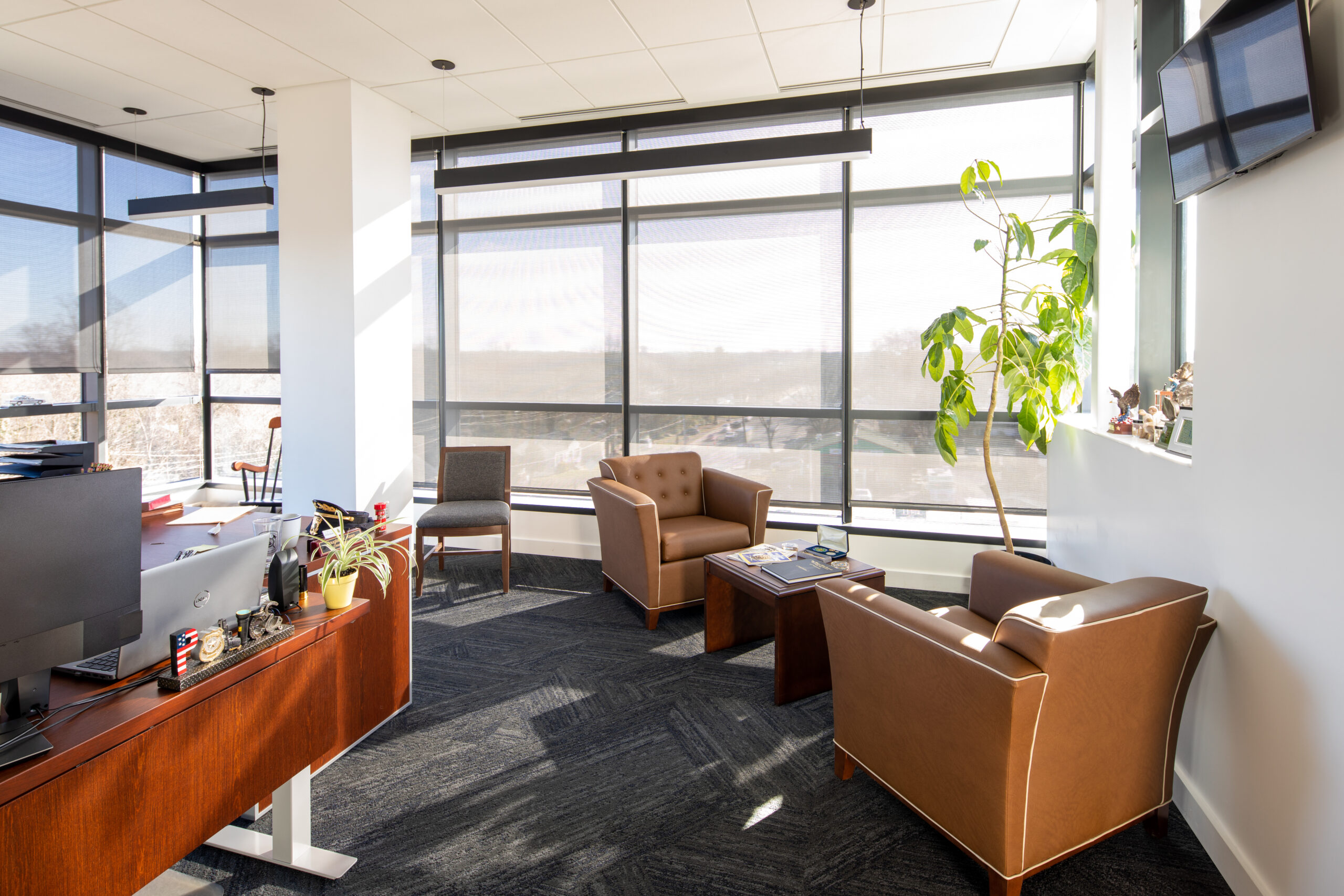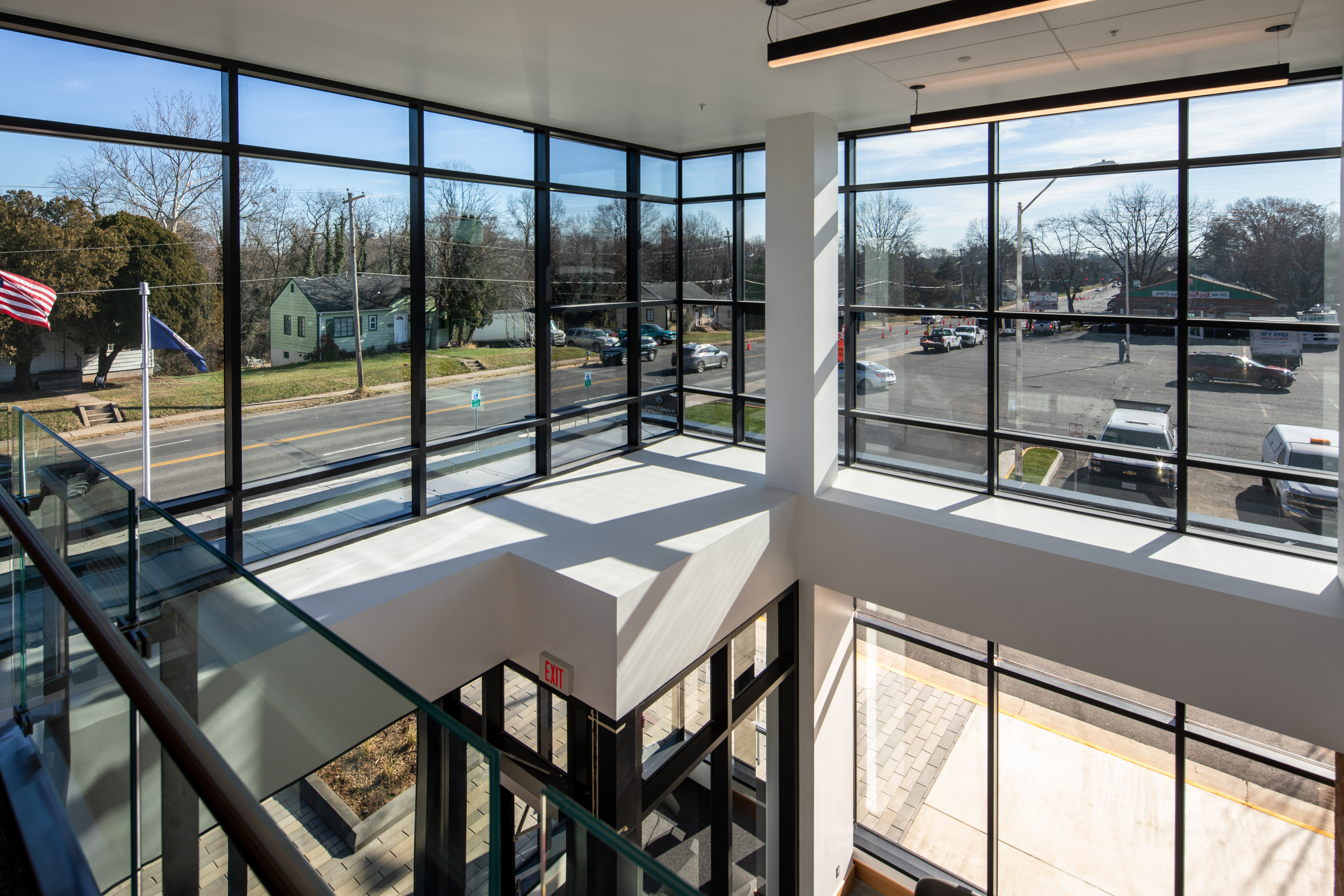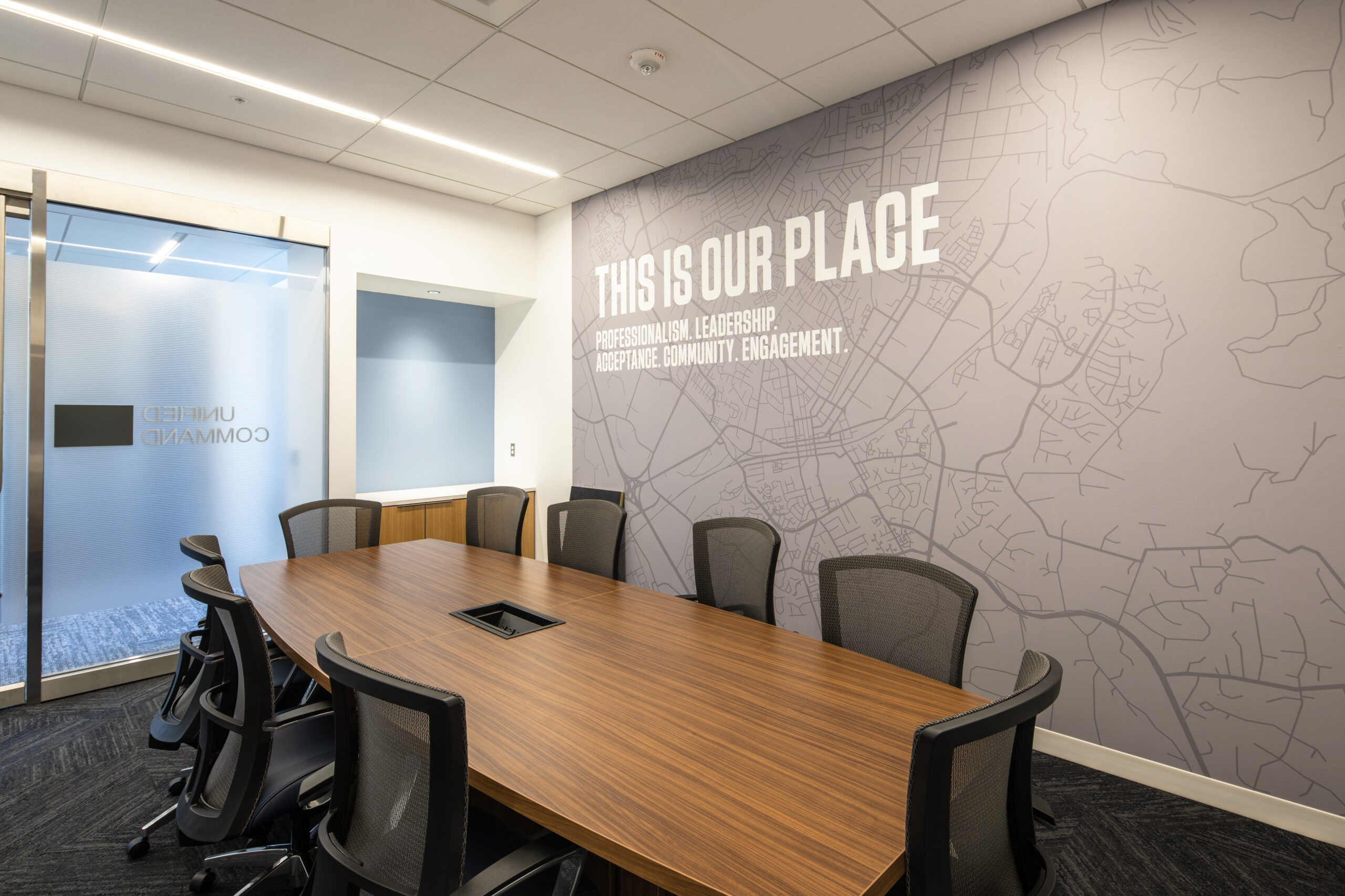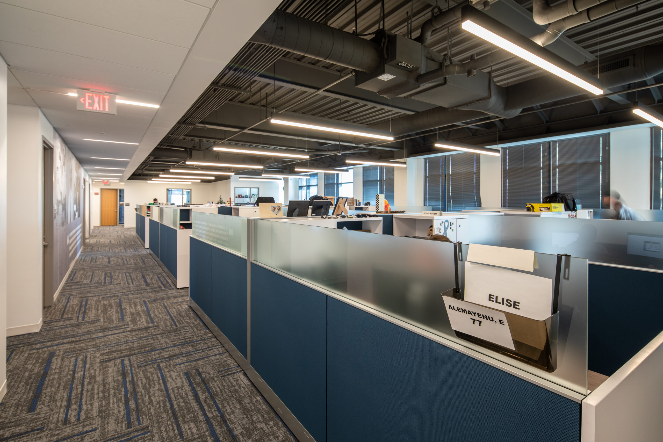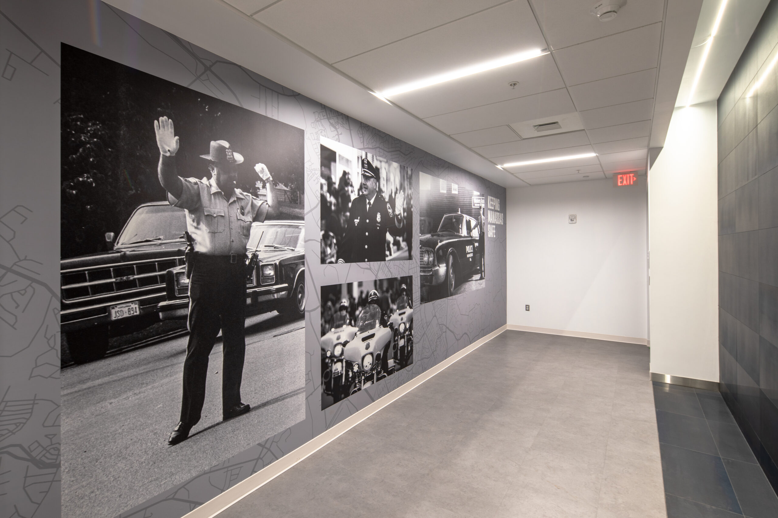 The building features specialized systems and finishes to support public safety operations, including secure access control, communications infrastructure, and adaptable interior layouts for offices and training spaces. Site work included clearing, grading, asphalt paving, sidewalks, landscaping, storm drainage, and utility installation.